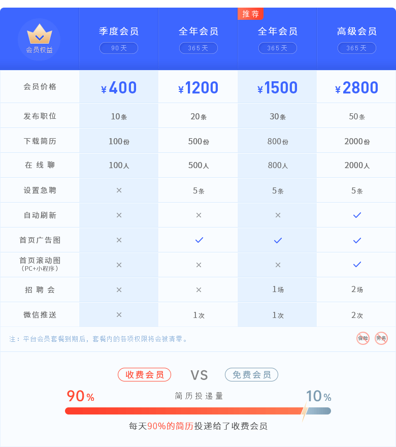 注: 所有会员期间内均享受首页推荐企业、每天无限次刷新职位权限。会员到期后剩余下载简历数将会被清零。