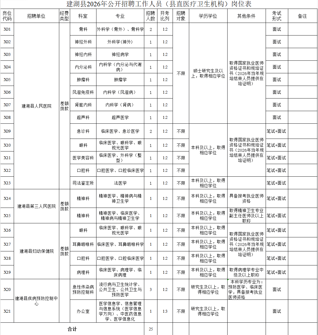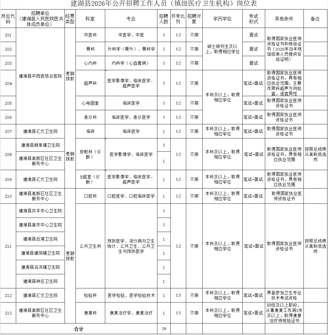 本次招聘岗位均为专业技术岗位,具体详见《建湖县2026年公开招聘工作人员(县直医疗卫生机构)岗位表》《建湖县2026年公开招聘工作人员(镇级医疗卫生机构)岗位表》(以下简称《岗位表》,附件1、附件2)。